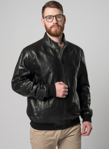 Классическая мужская куртка-бомбер на молнии в черном цвете. Это изделие выполнено из приятной на ощупь, прочной и износостойкой натуральной кожи. Фасон бомбер позволяет куртке надежно фиксироваться на теле за счет резинок по низу изделия и на рукавах. Модель дополнена невысоким воротником-стойкой и кнопками. Отлично сочетается с брюками, джинсами, ботинками и кроссовками. Подходит для городской жизни.