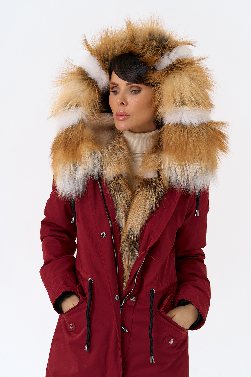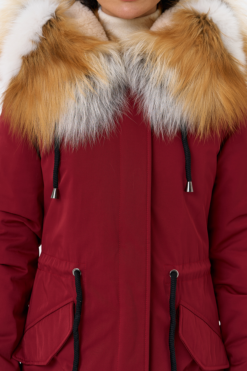 Крой воротника - капюшон, отделка лиса рыжая, овчина