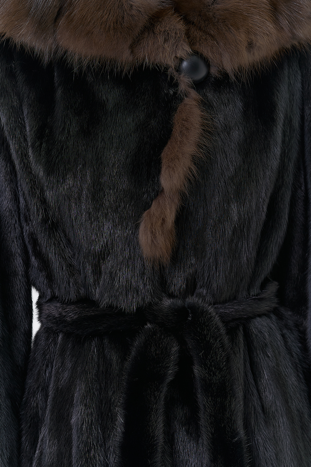 Раскладка меха в роспуск. По талии есть пояс, который моделирует объем изделия.